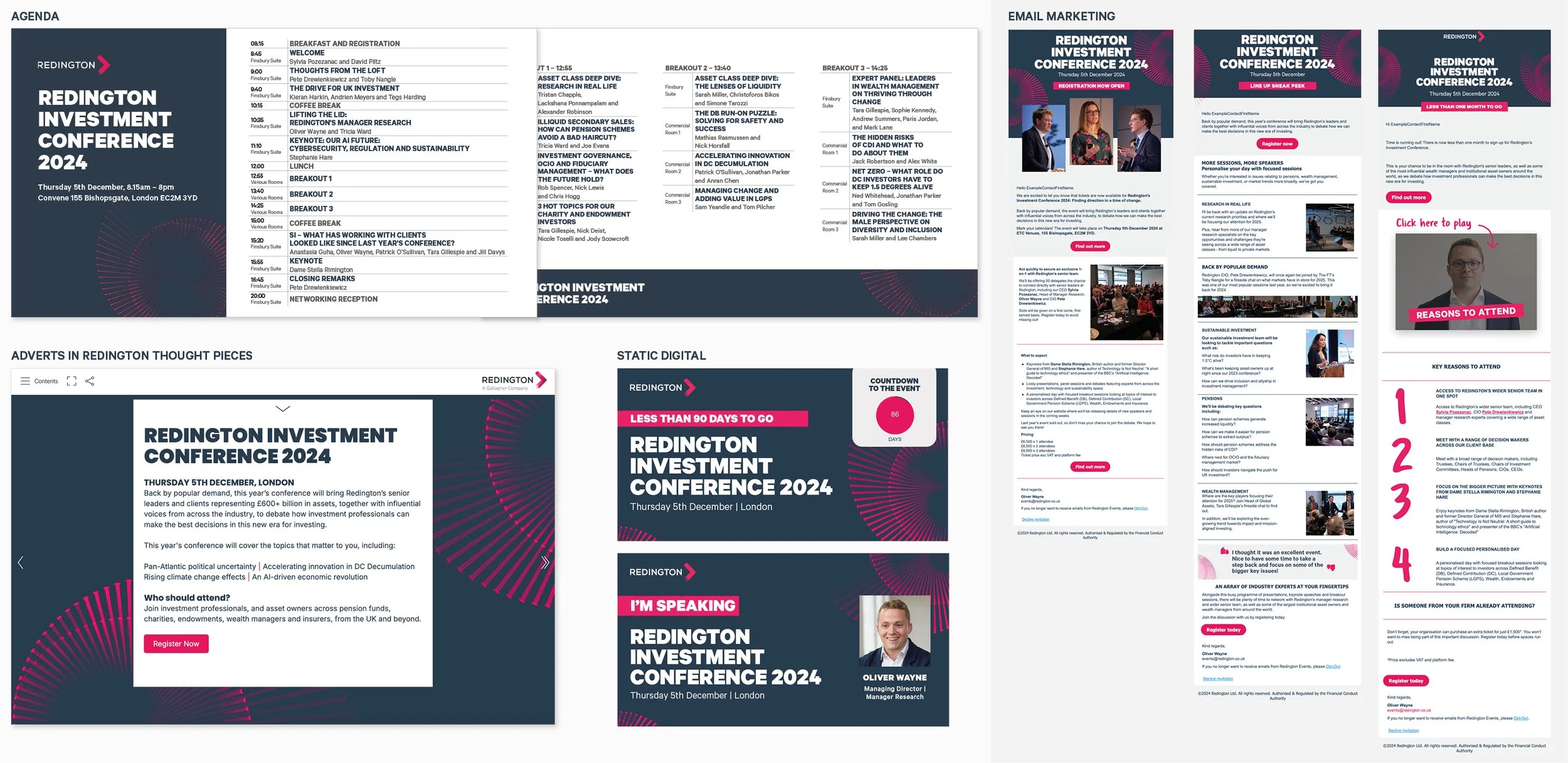 I co-led the marketing strategy and executed all design work, developing a distinctive visual identity that translated across social media, event spaces, print materials, PPT’s and landing pages. We mapped the full user journey, built targeted email campaigns in Cvent and continuously refined copy and creative based on engagement data to maximise impact.