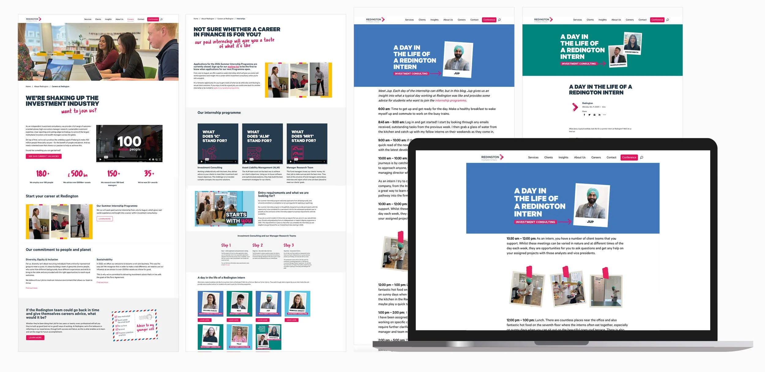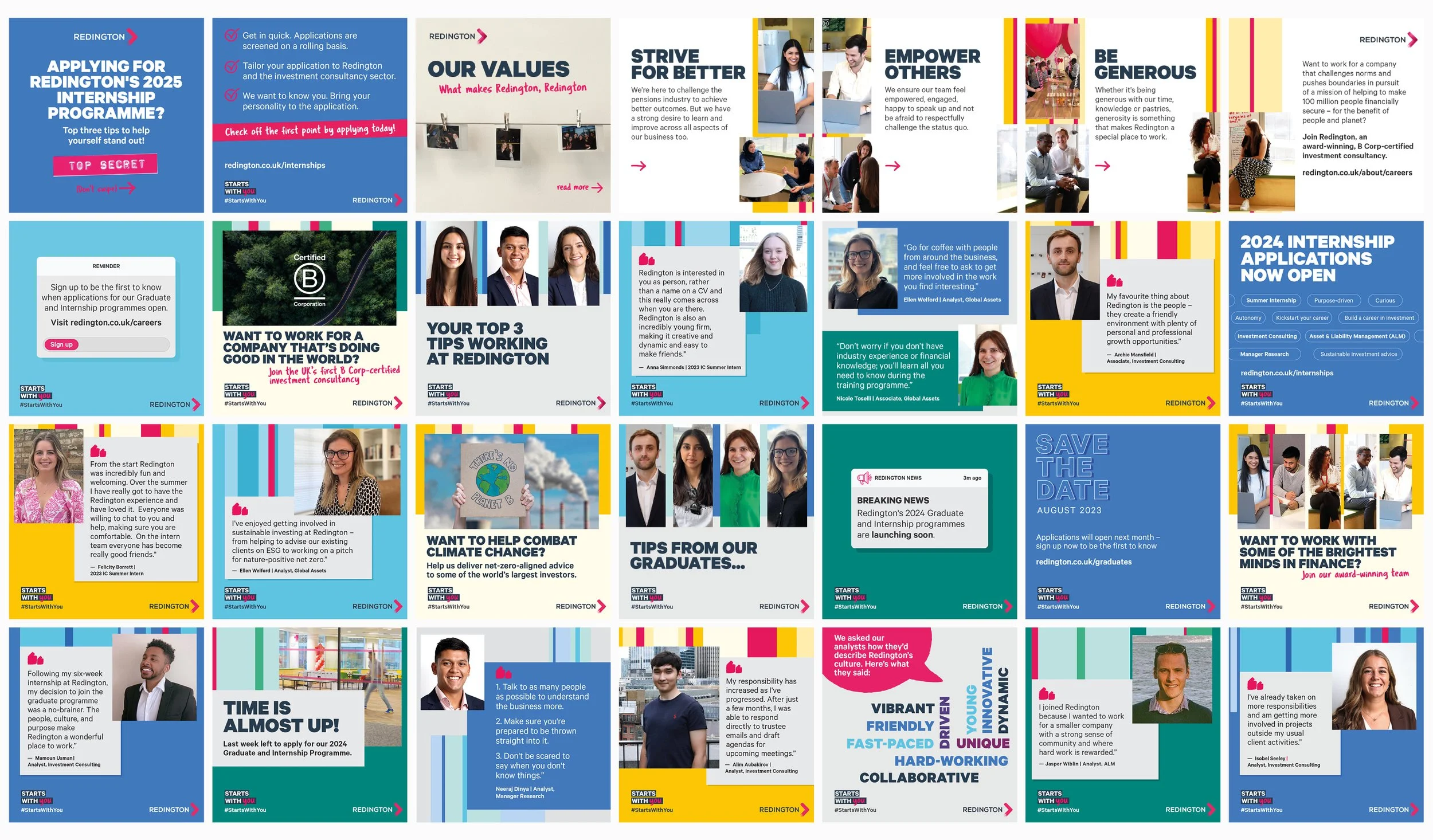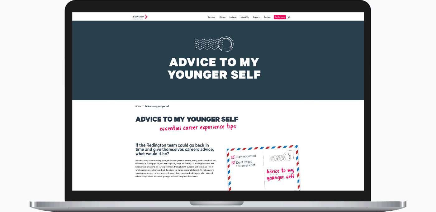 As part of the campaign refresh, I introduced the tagline “Starts with you,” a call to action that positioned graduates as the drivers of their own journey, reflecting Redington’s culture of innovation. I shifted the visual identity by using the secondary colour palette to soften the corporate tone while retaining raspberry accents for brand recognition. Photography moved away from staged setups to natural, candid imagery that captured real people and moments. The content, rebuilt around graduate insights highlighted themes of growth, collaboration and purpose to create a campaign that felt both authentic and aspirational.